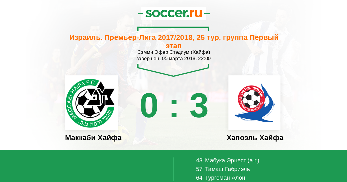 Израиль. Премьер-Лига 11.02.2017 Маккаби Хайфа Логотип футбольный клуб Маккаби Хайфа 0:3 Логотип футбольный клуб Хапоэль Хайфа Хапоэль Хайфа