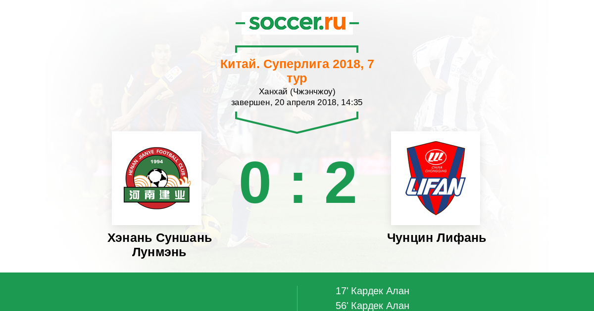 Китай. Суперлига 06.05.2017 Чунцин Лифань Логотип футбольный клуб Чунцин Лифань 2:3 Логотип футбольный клуб Хэнань Суншань Лунмэнь (Чжэнчжоу) Хэнань Суншань Лунмэнь