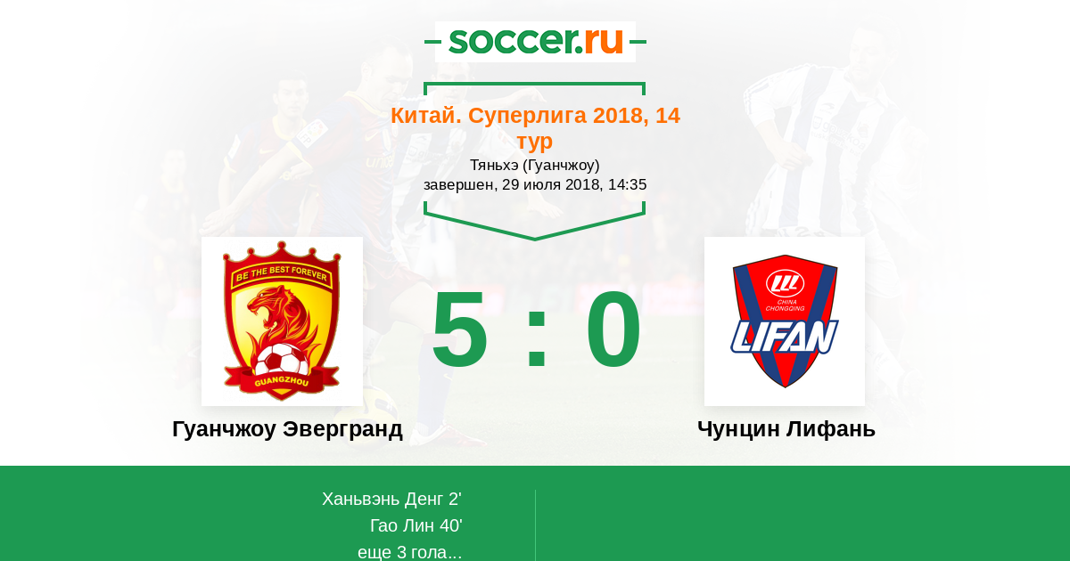 Китай. Суперлига 05.07.2015 Гуанчжоу Эвергранд Логотип футбольный клуб Гуанчжоу Эвергранд 7:0 Логотип футбольный клуб Чунцин Лифань Чунцин Лифань