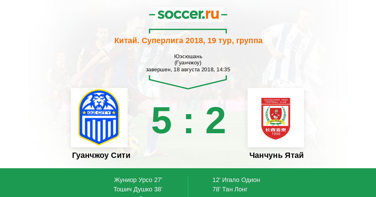 Китай. Суперлига 16.07.2017 Чанчунь Ятай Логотип футбольный клуб Чанчунь Ятай 3:2 Логотип футбольный клуб Гуанчжоу Сити Гуанчжоу Сити
