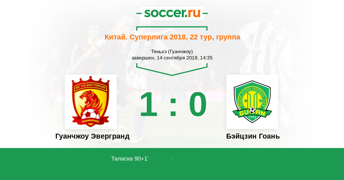 Китай. Суперлига 26.10.2014 Гуанчжоу Эвергранд Логотип футбольный клуб Гуанчжоу Эвергранд 0:1 Логотип футбольный клуб Бэйцзин Гоань (Пекин) Бэйцзин Гоань