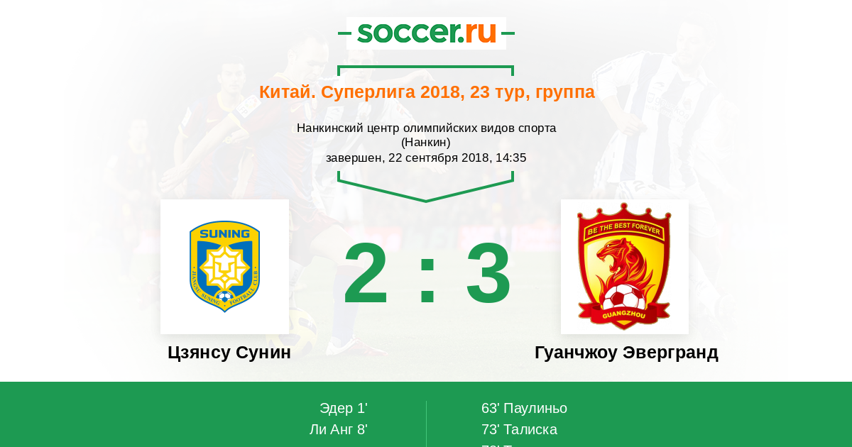 Китай. Суперлига 09.08.2014 Гуанчжоу Эвергранд Логотип футбольный клуб Гуанчжоу Эвергранд 3:0 Логотип футбольный клуб Цзянсу Сунин Цзянсу Сунин