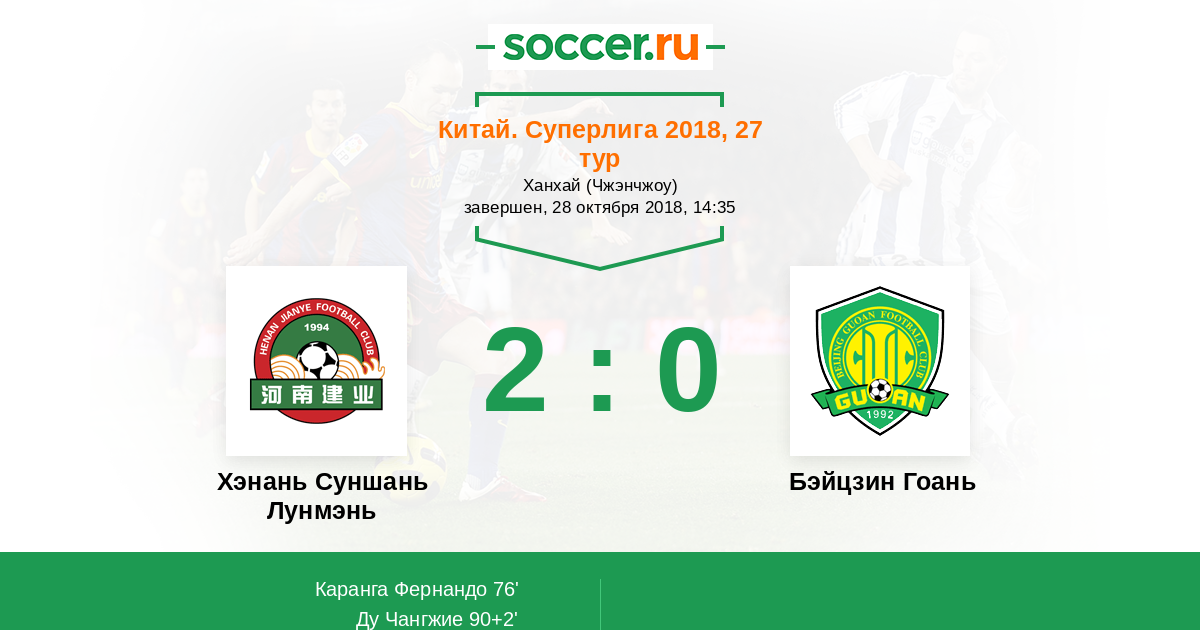 Китай. Суперлига 18.07.2018 Бэйцзин Гоань Логотип футбольный клуб Бэйцзин Гоань (Пекин) 2:1 Логотип футбольный клуб Хэнань Суншань Лунмэнь (Чжэнчжоу) Хэнань Суншань Лунмэнь
