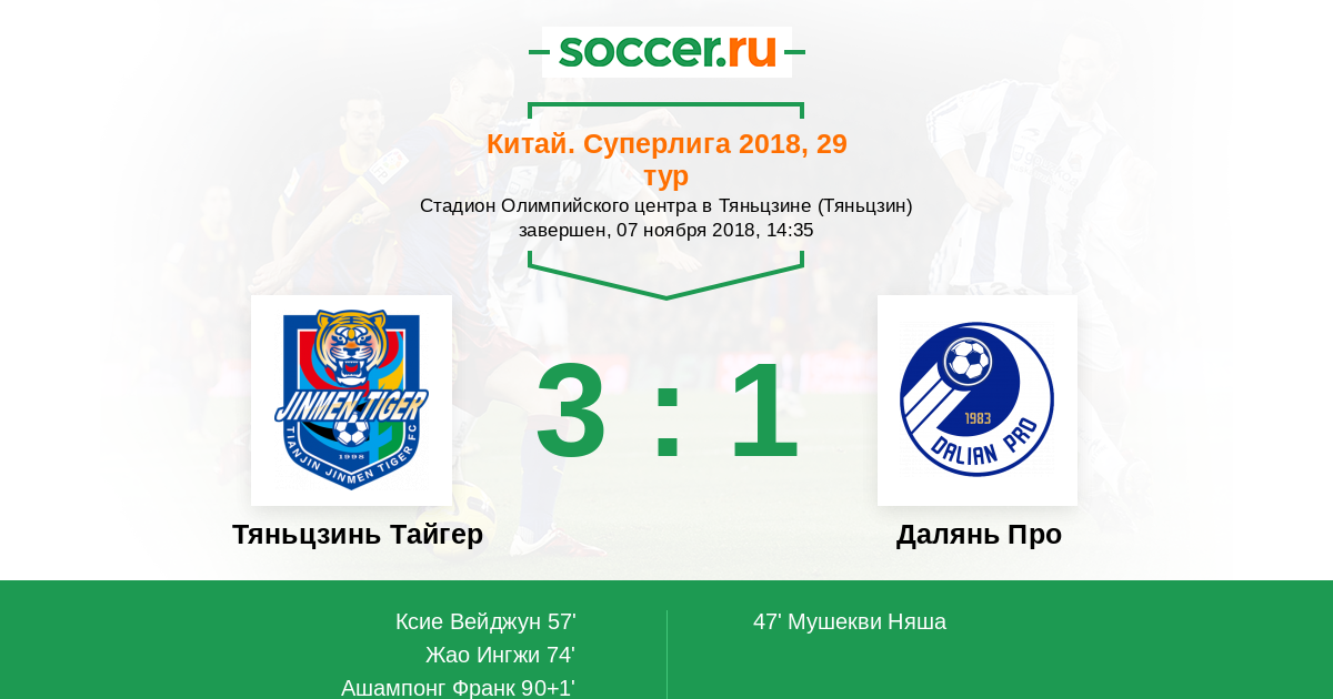 Китай. Суперлига 28.07.2018 Далянь Про Логотип футбольный клуб Далянь Про 2:3 Логотип футбольный клуб Тяньцзинь Тайгер Тяньцзинь Тайгер