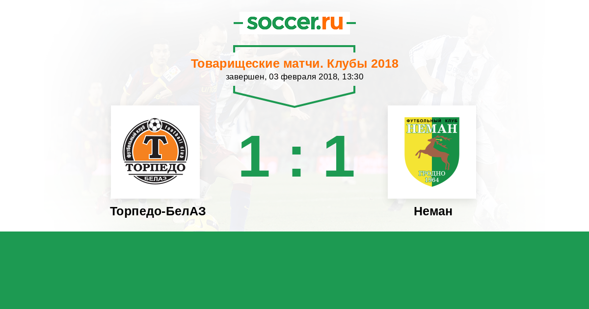 Товарищеские матчи. Клубы 02.02.2019 Торпедо-БелАЗ Логотип футбольный клуб Торпедо-БелАЗ (Жодино) 4:1 Логотип футбольный клуб Неман (Гродно) Неман