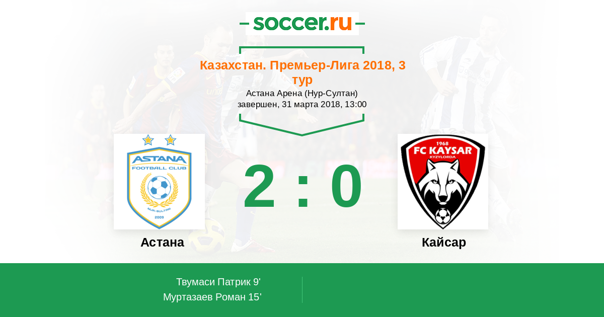 Казахстан. Премьер-лига 25.04.2015 Кайсар Логотип футбольный клуб Кайсар (Кызылорда) 2:1 Логотип футбольный клуб Астана Астана