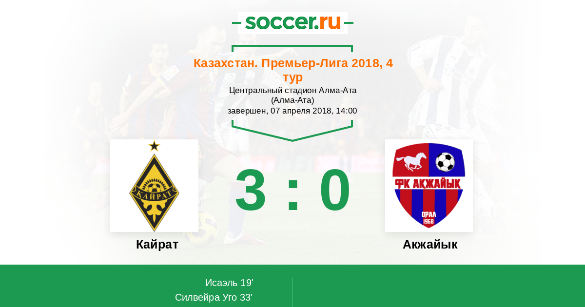 Казахстан. Премьер-лига 29.04.2017 Кайрат Логотип футбольный клуб Кайрат (Алматы) 4:1 Логотип футбольный клуб Акжайык (Уральск) Акжайык