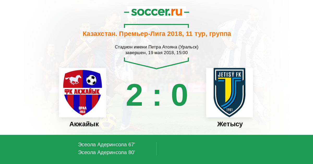 Казахстан. Премьер-лига 16.07.2016 Жетысу Логотип футбольный клуб Жетысу (Талдыкорган) 2:0 Логотип футбольный клуб Акжайык (Уральск) Акжайык
