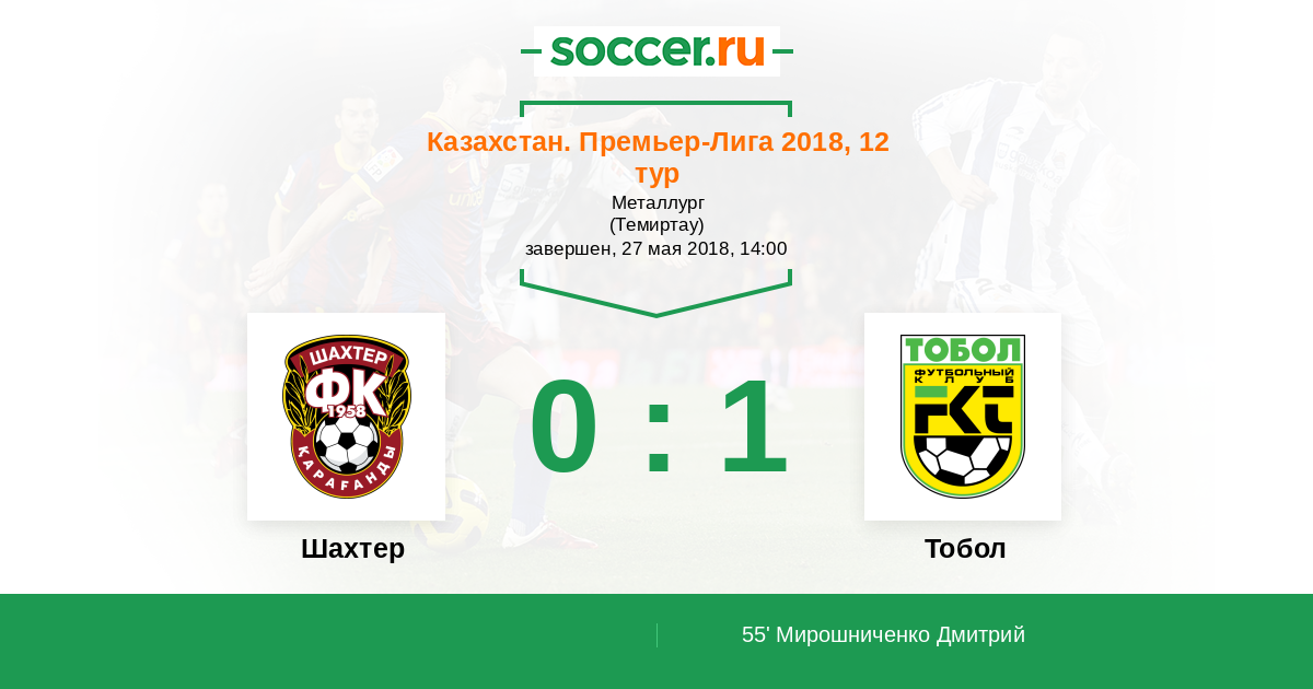 Казахстан. Премьер-лига 29.05.2016 Шахтер Логотип футбольный клуб Шахтер (Караганда) 1:0 Логотип футбольный клуб Тобол (Костанай) Тобол