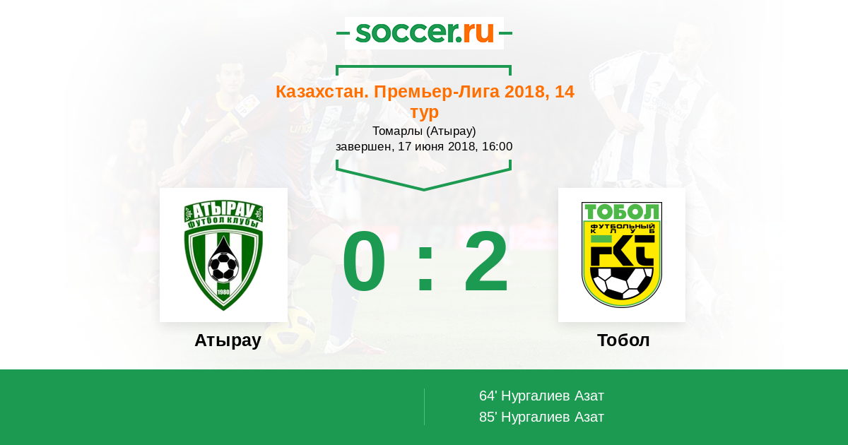 Казахстан. Премьер-лига 20.06.2015 Тобол Логотип футбольный клуб Тобол (Костанай) 2:2 Логотип футбольный клуб Атырау Атырау