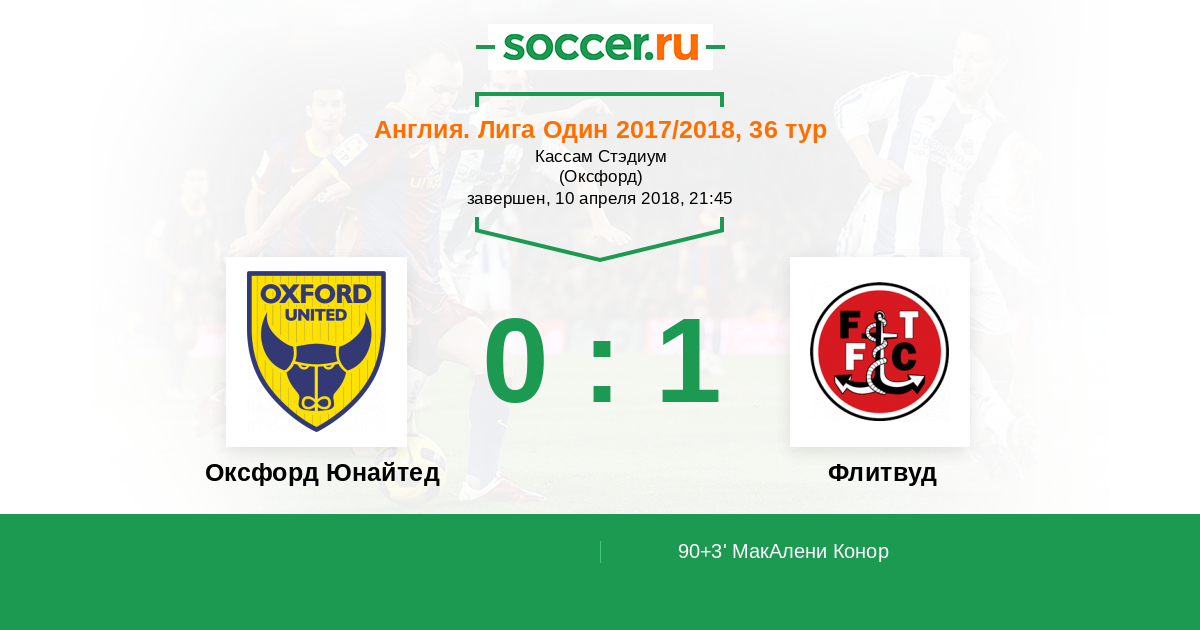 Англия. Первая Футбольная Лига 28.10.2017 Флитвуд Логотип футбольный клуб Флитвуд 2:0 Логотип футбольный клуб Оксфорд Юнайтед Оксфорд Юнайтед
