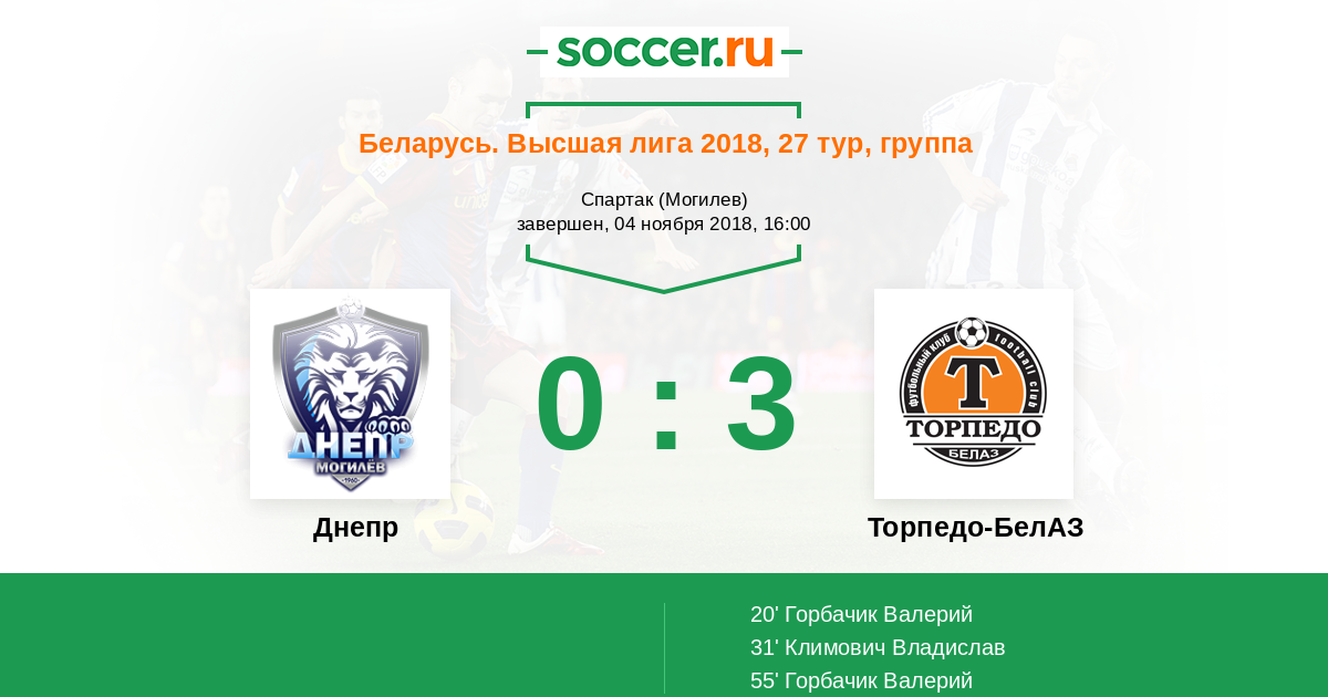 Беларусь. Высшая лига 17.06.2018 Торпедо-БелАЗ Логотип футбольный клуб Торпедо-БелАЗ (Жодино) 1:0 Логотип футбольный клуб Днепр (Могилев) Днепр
