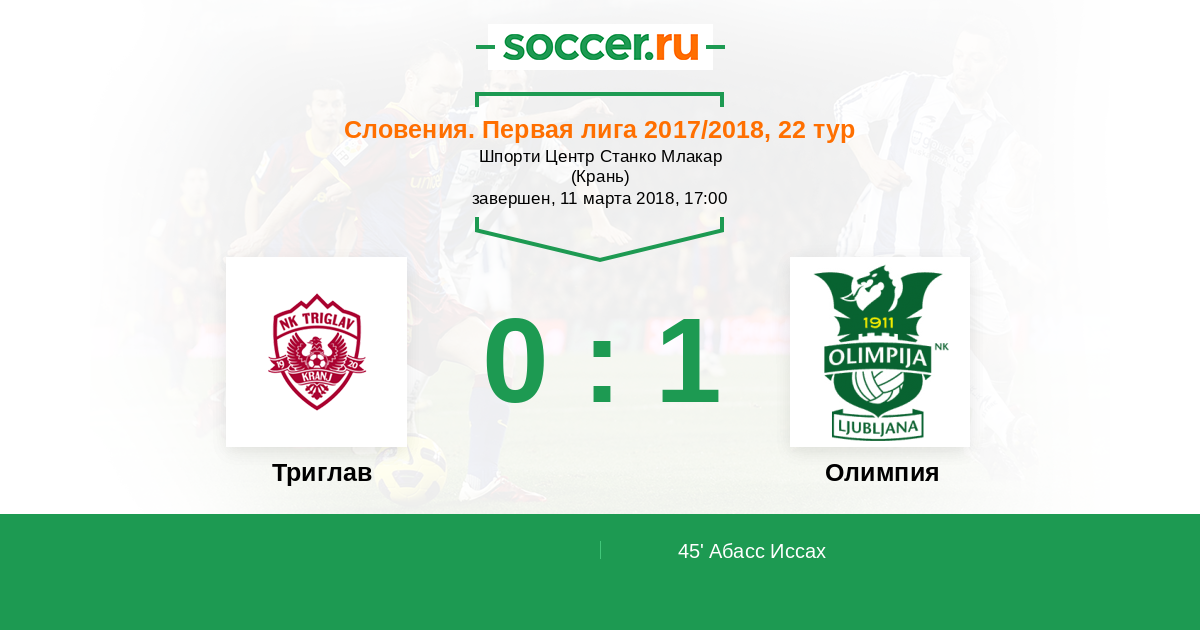 Словения. Первая Лига 20.10.2017 Олимпия Логотип футбольный клуб Олимпия (Любляна) 3:0 Логотип футбольный клуб Триглав (Крань) Триглав