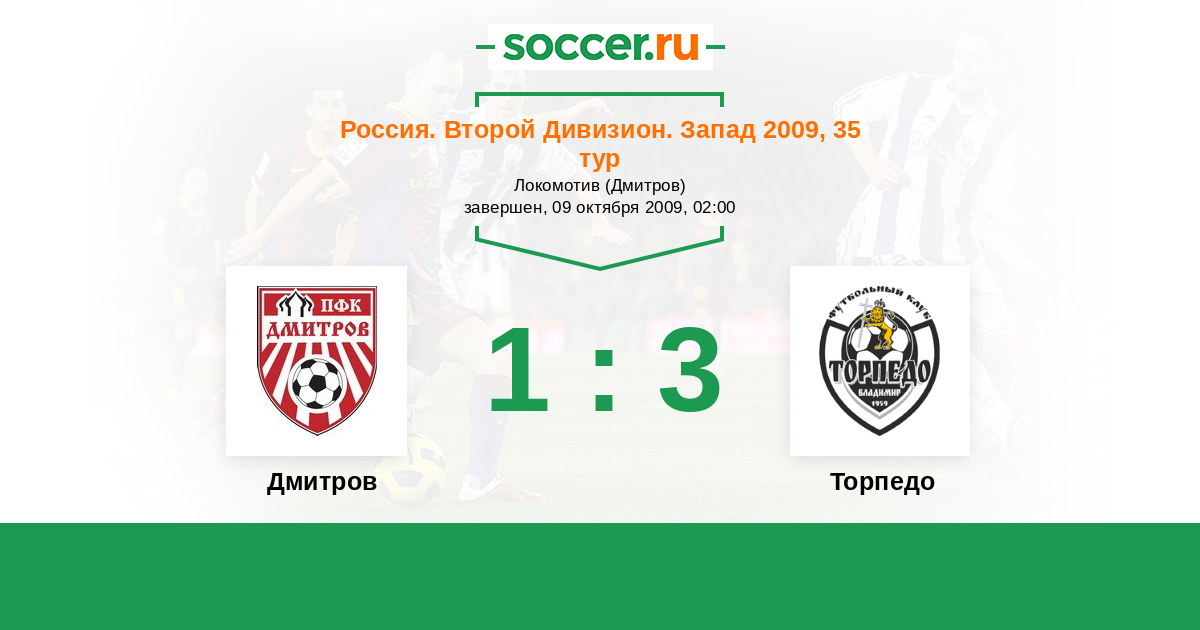 Россия. Вторая лига. Группа 2 09.10.2009 Дмитров Логотип футбольный клуб Дмитров 1:3 Логотип футбольный клуб Торпедо (Владимир) Торпедо