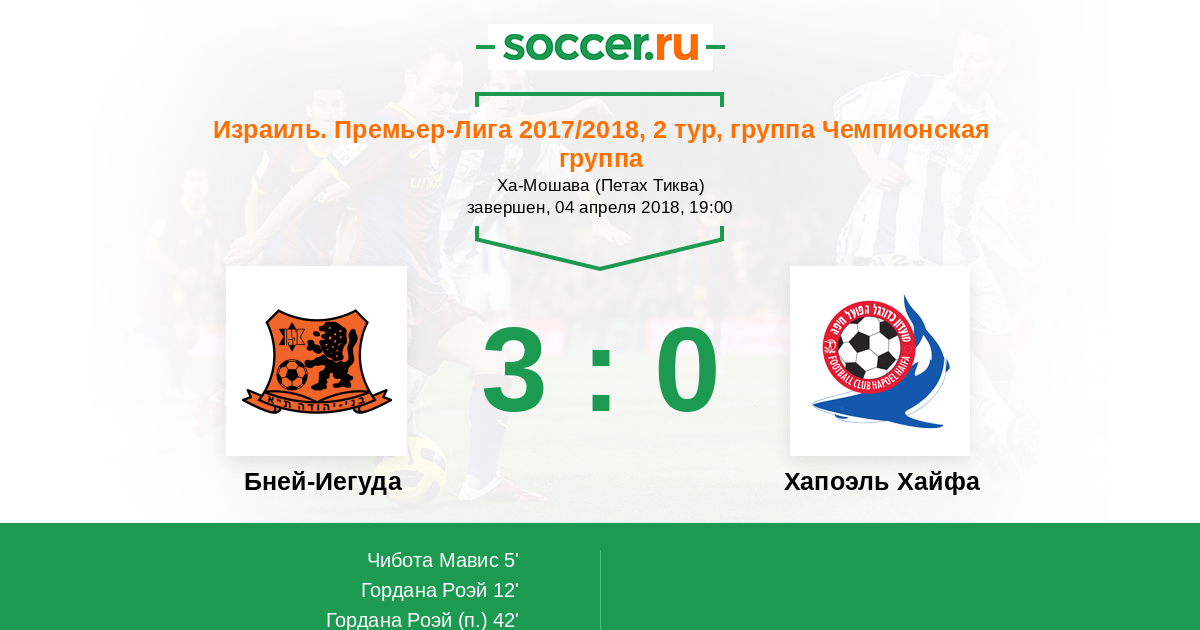 Израиль. Премьер-Лига 10.11.2018 Хапоэль Хайфа Логотип футбольный клуб Хапоэль Хайфа 0:2 Логотип футбольный клуб Бней-Иегуда (Тель-Авив) Бней-Иегуда