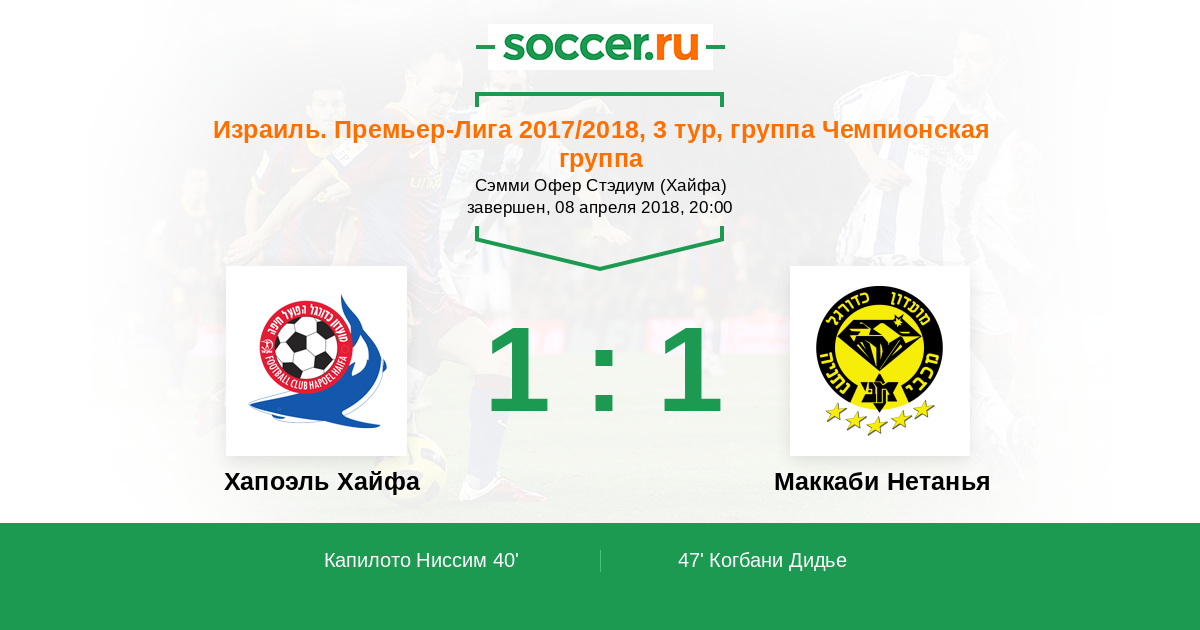 Израиль. Премьер-Лига 18.10.2014 Хапоэль Хайфа Логотип футбольный клуб Хапоэль Хайфа 3:2 Логотип футбольный клуб Маккаби Нетанья Маккаби Нетанья