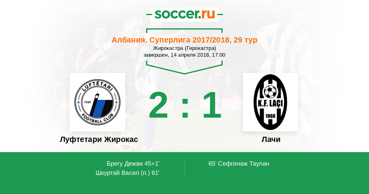 Албания. Суперлига 06.05.2017 Лачи Логотип футбольный клуб Лачи 2:1 Логотип футбольный клуб Луфтетари Жирокас (Жирокастер) Луфтетари Жирокас