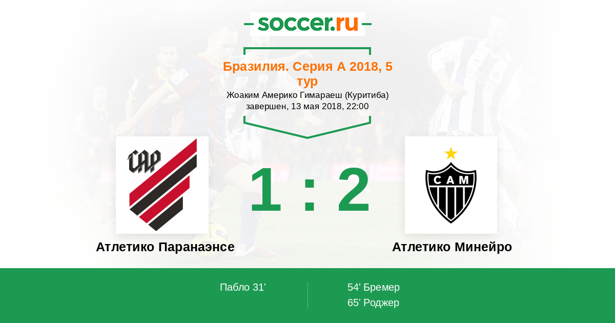 Бразилия. Серия А 24.05.2015 Атлетико Паранаэнсе Логотип футбольный клуб Атлетико Паранаэнсе (Куритиба) 1:0 Логотип футбольный клуб Атлетико Минейро (Белу-Оризонти) Атлетико Минейро
