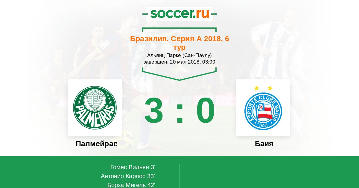 Бразилия. Серия А 13.10.2017 Палмейрас Логотип футбольный клуб Палмейрас (Сан-Паулу) 2:2 Логотип футбольный клуб Баия (Салвадор) Баия