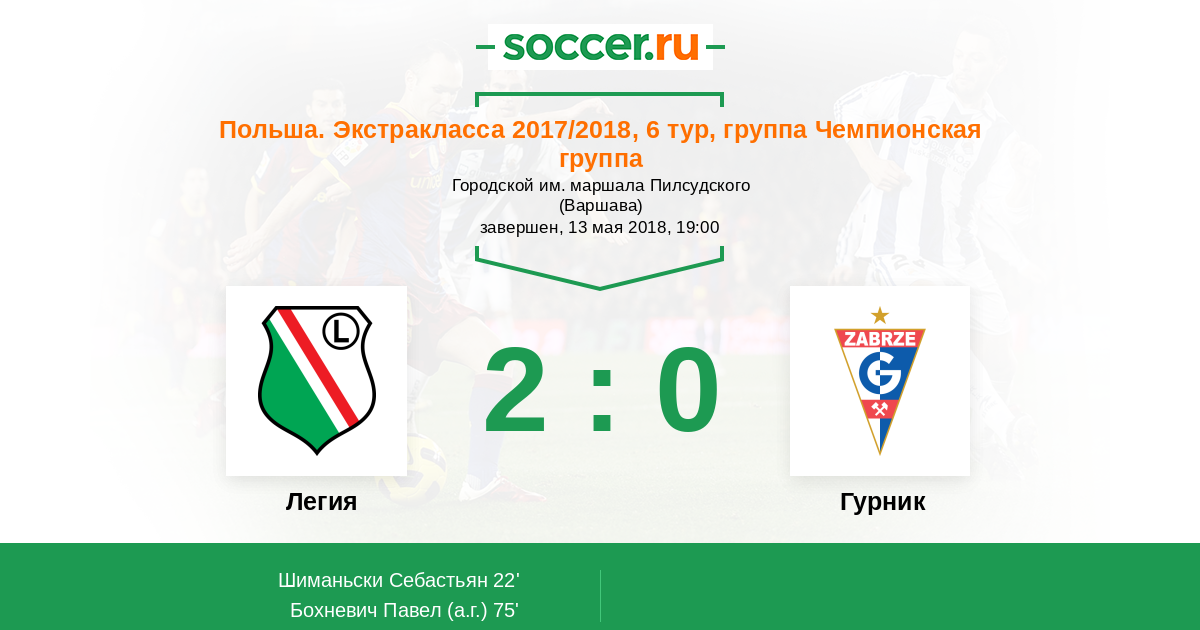 Польша. Экстракласса 19.11.2017 Легия Логотип футбольный клуб Легия (Варшава) 1:0 Логотип футбольный клуб Гурник (Забже) Гурник