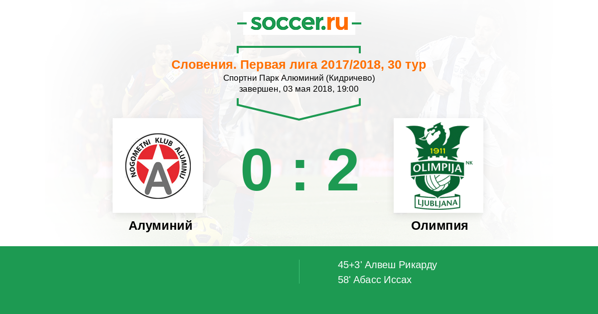 Словения. Первая Лига 17.04.2013 Алуминий Логотип футбольный клуб Алуминий (Кидричево) 2:0 Логотип футбольный клуб Олимпия (Любляна) Олимпия