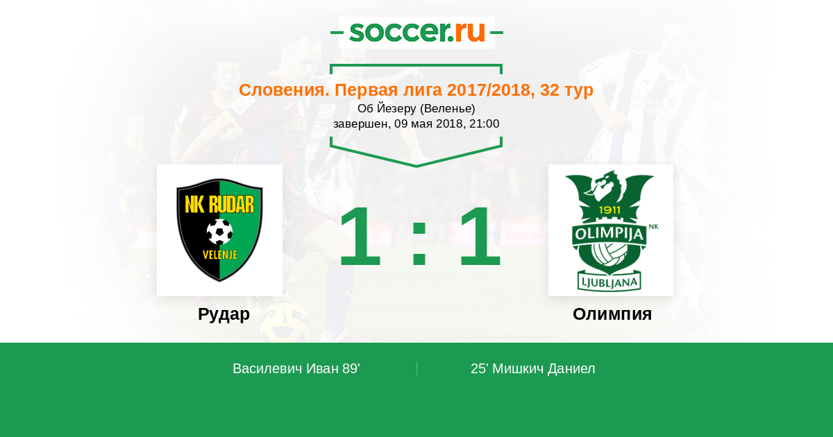 Словения. Первая Лига 12.08.2017 Олимпия Логотип футбольный клуб Олимпия (Любляна) 4:0 Логотип футбольный клуб Рудар (Велене) Рудар