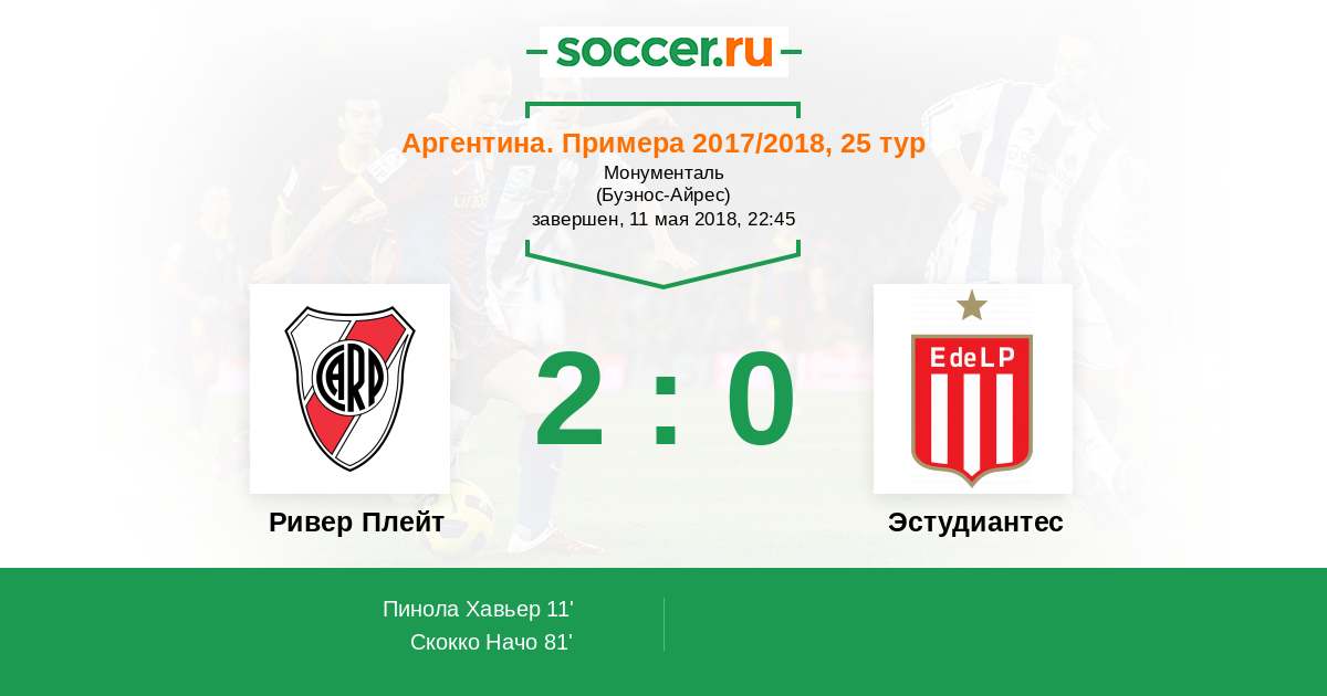Аргентина. Суперлига 03.11.2018 Эстудиантес Логотип футбольный клуб Эстудиантес (Ла-Плата) 1:0 Логотип футбольный клуб Ривер Плейт (Буэнос-Айрес) Ривер Плейт