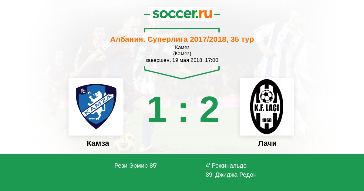 Албания. Суперлига 18.03.2018 Лачи Логотип футбольный клуб Лачи 2:0 Логотип футбольный клуб Камза (Камез) Камза
