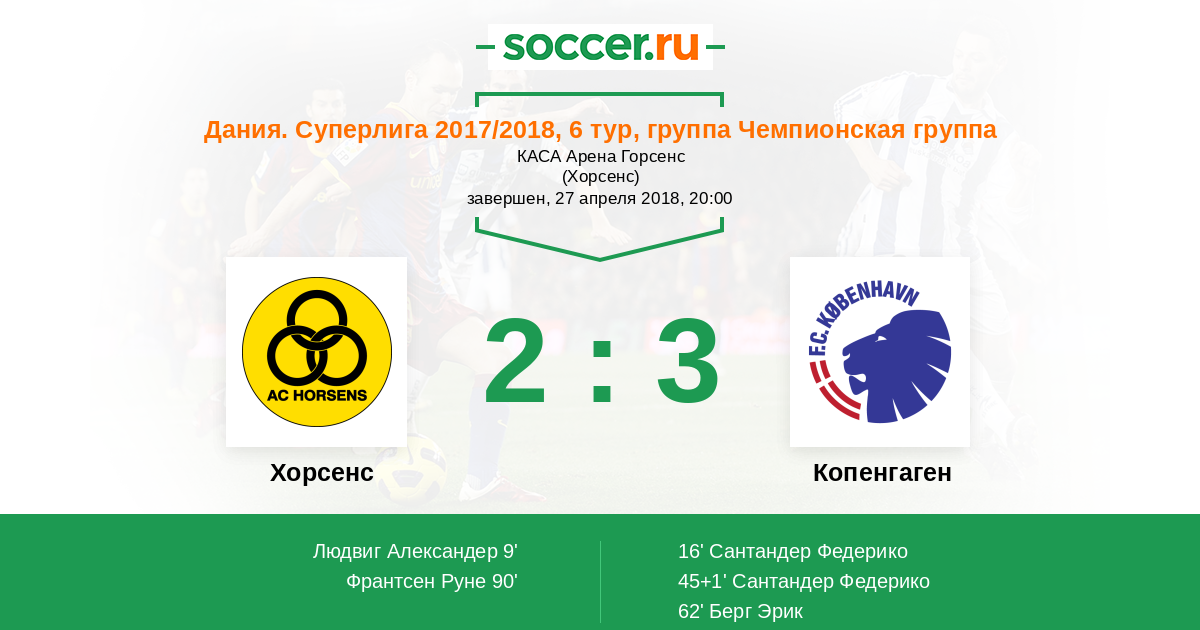 Дания. Суперлига 29.10.2017 Хорсенс Логотип футбольный клуб Хорсенс 1:1 Логотип футбольный клуб Копенгаген Копенгаген