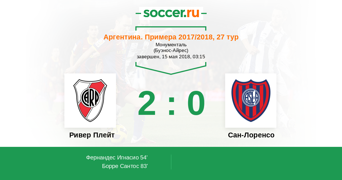 Аргентина. Суперлига 04.06.2017 Сан-Лоренсо Логотип футбольный клуб Сан-Лоренсо (Буэнос-Айрес) 2:1 Логотип футбольный клуб Ривер Плейт (Буэнос-Айрес) Ривер Плейт