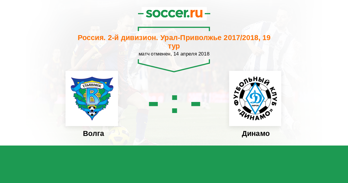 Россия. Вторая лига. Группа 4 18.04.2013 Волга Логотип футбольный клуб Волга (Ульяновск) 1:0 Логотип футбольный клуб Динамо Киров Динамо Киров