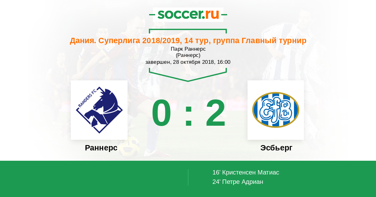 Дания. Суперлига 08.11.2014 Раннерс Логотип футбольный клуб Раннерс 3:2 Логотип футбольный клуб Эсбьерг Эсбьерг