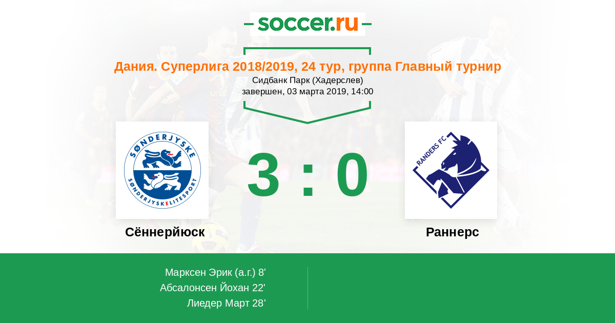 Дания. Суперлига 08.04.2018 Сённерйюск Логотип футбольный клуб Сённерйюск (Хадерслев) 1:0 Логотип футбольный клуб Раннерс Раннерс