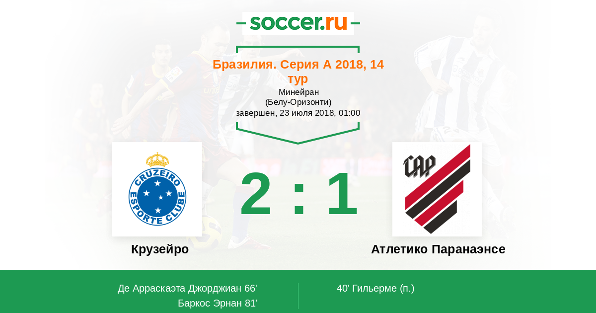Бразилия. Кубок 16.07.2018 Крузейро Логотип футбольный клуб Крузейро (Белу-Оризонти) 1:1 Логотип футбольный клуб Атлетико Паранаэнсе (Куритиба) Атлетико Паранаэнсе