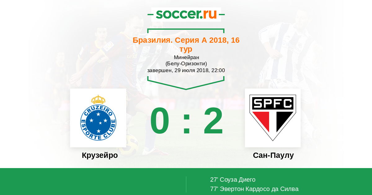 Бразилия. Серия А 13.08.2017 Сан-Паулу Логотип футбольный клуб Сан-Паулу 3:2 Логотип футбольный клуб Крузейро (Белу-Оризонти) Крузейро