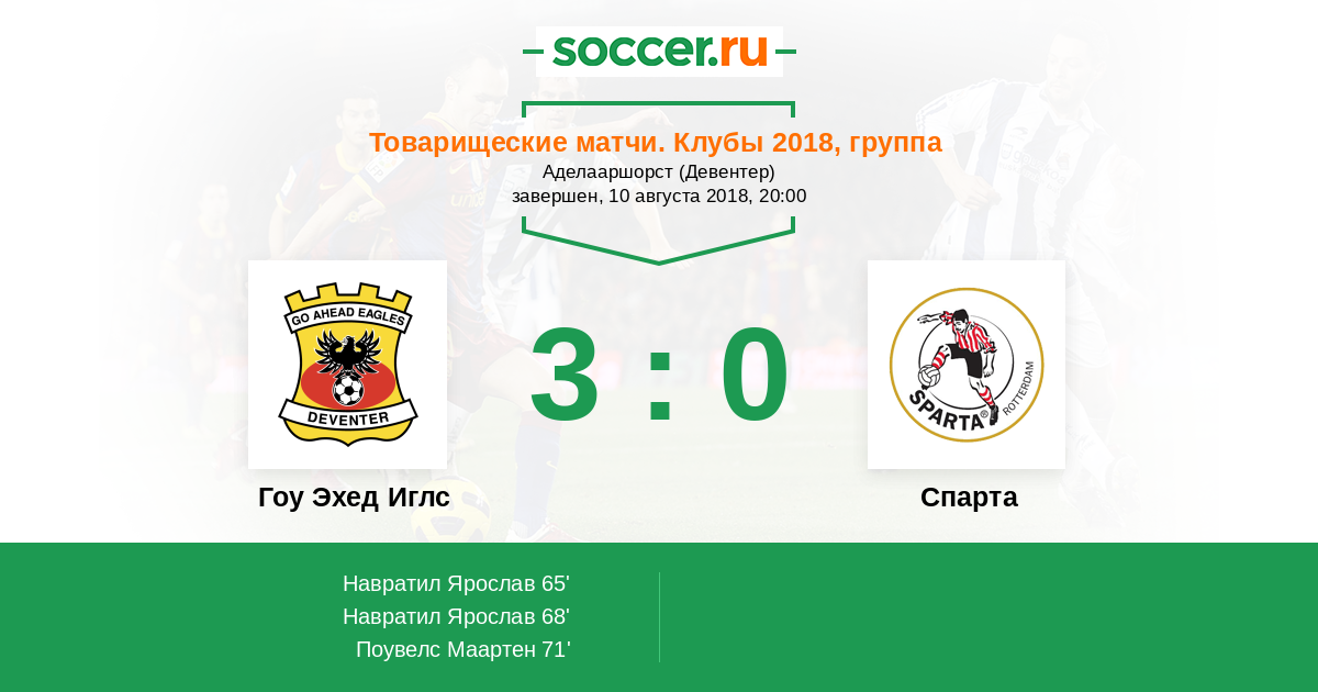 Нидерланды. Первый дивизион 16.08.2010 Гоу Эхед Иглс Логотип футбольный клуб Гоу Эхед Иглс (Девентер) 1:2 Логотип футбольный клуб Спарта (Роттердам) Спарта