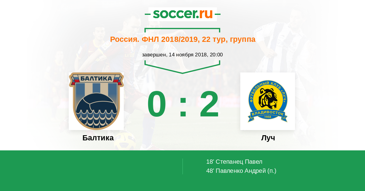 Россия. Первая лига 31.03.2018 Луч Логотип футбольный клуб Луч (Владивосток) 0:0 Логотип футбольный клуб Балтика (Калининград) Балтика