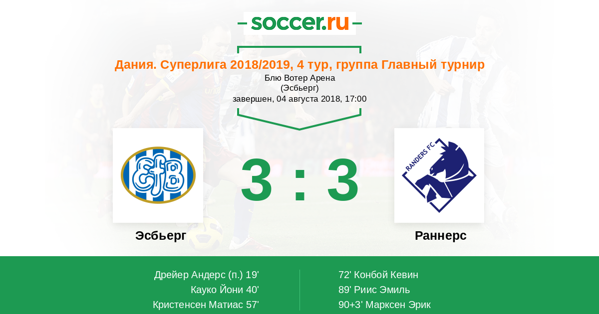 Дания. Суперлига 19.08.2013 Раннерс Логотип футбольный клуб Раннерс 3:2 Логотип футбольный клуб Эсбьерг Эсбьерг