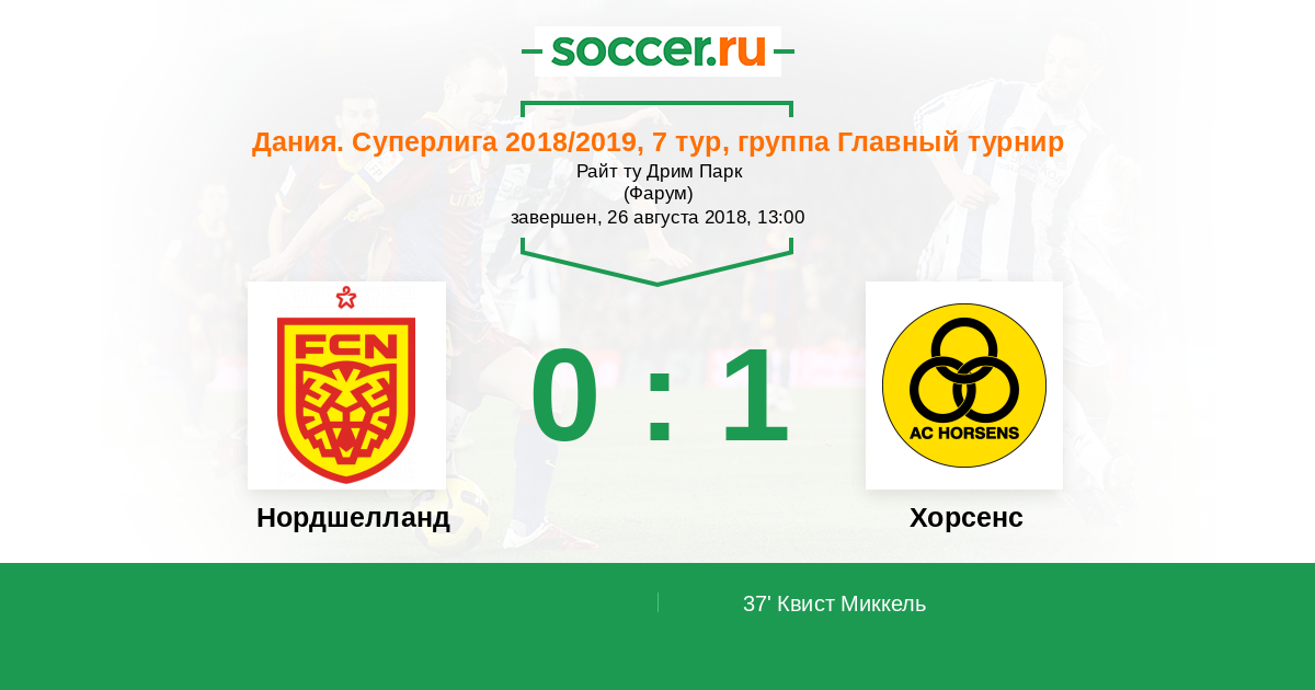 Дания. Суперлига 08.09.2017 Хорсенс Логотип футбольный клуб Хорсенс 2:2 Логотип футбольный клуб Нордшелланд (Фарум) Нордшелланд