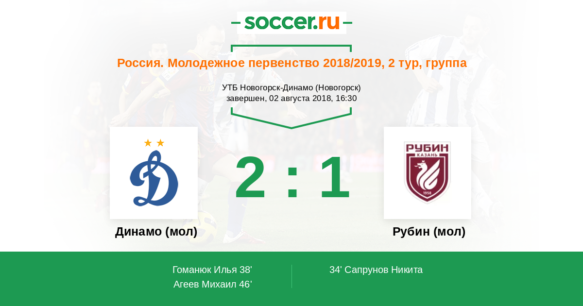 Россия. Премьер-Лига U21 08.11.2019 Рубин (мол) Логотип футбольный клуб Рубин (мол) (Казань) 1:0 Логотип футбольный клуб Динамо (мол) (Москва) Динамо (мол)