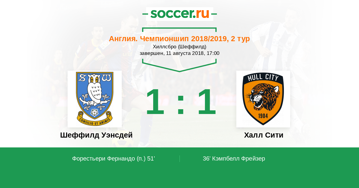 Англия. Чемпионшип 06.10.2012 Шеффилд Уэнсдей Логотип футбольный клуб Шеффилд Уэнсдей 0:1 Логотип футбольный клуб Халл Сити (Кингстон-апон-Халл) Халл Сити