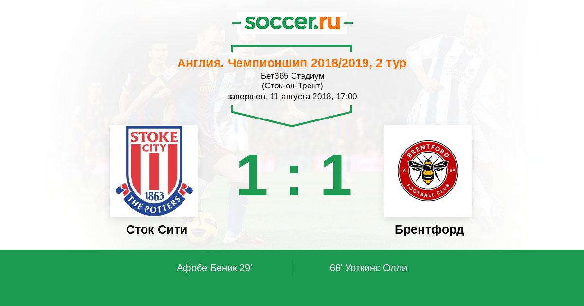 Англия. Чемпионшип 21.09.2019 Брентфорд Логотип футбольный клуб Брентфорд (Лондон) 0:0 Логотип футбольный клуб Сток Сити (Сток-он-Трент) Сток Сити