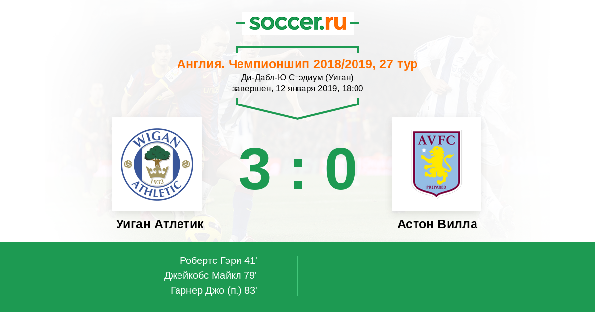 Англия. Чемпионшип 18.03.2017 Уиган Атлетик Логотип футбольный клуб Уиган Атлетик 0:2 Логотип футбольный клуб Астон Вилла (Бирмингем) Астон Вилла
