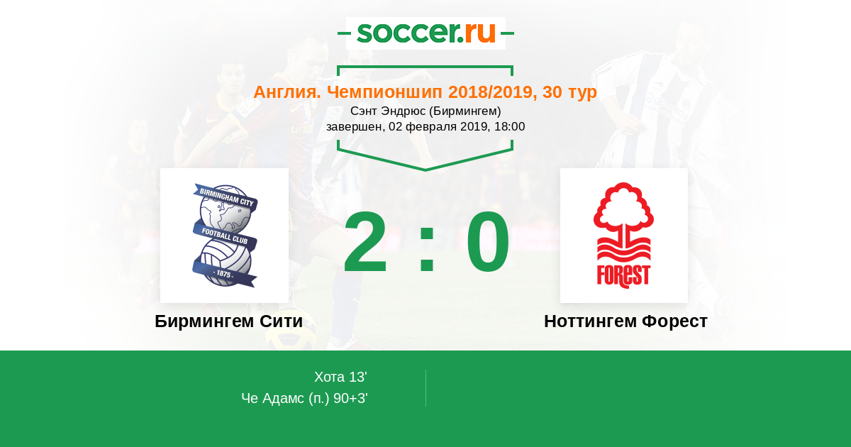 Англия. Чемпионшип 01.02.2020 Бирмингем Сити Логотип футбольный клуб Бирмингем Сити 2:1 Логотип футбольный клуб Ноттингем Форест Ноттингем Форест