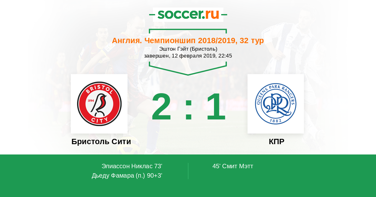Англия. Чемпионшип 01.02.2020 КПР Логотип футбольный клуб КПР (Лондон) 0:1 Логотип футбольный клуб Бристоль Сити Бристоль Сити