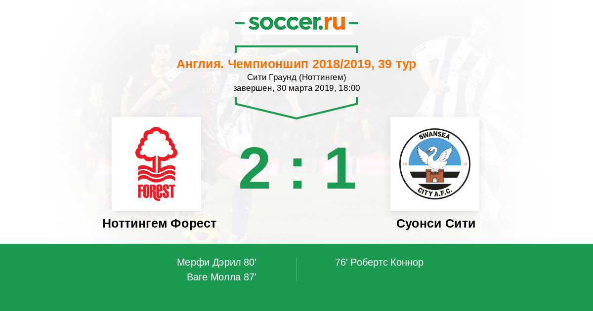 Англия. Чемпионшип 15.09.2018 Суонси Сити Логотип футбольный клуб Суонси Сити 0:0 Логотип футбольный клуб Ноттингем Форест Ноттингем Форест