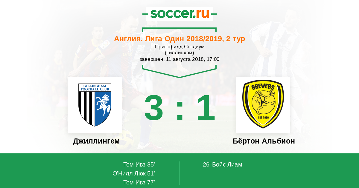 Англия. Первая Футбольная Лига 10.08.2019 Джиллингем Логотип футбольный клуб Джиллингем 1:2 Логотип футбольный клуб Бёртон Альбион (Бёртон-апон-Трент) Бёртон Альбион
