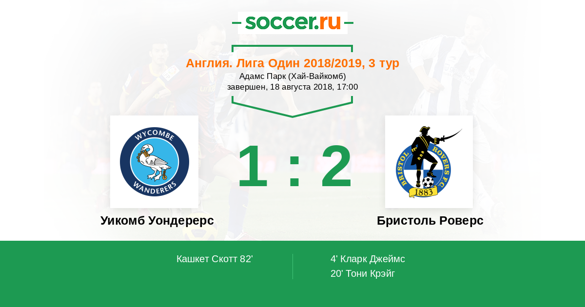 Англия. Первая Футбольная Лига 19.01.2019 Бристоль Роверс Логотип футбольный клуб Бристоль Роверс 0:1 Логотип футбольный клуб Уикомб Уондерерс (Хай-Вайкомб) Уикомб Уондерерс