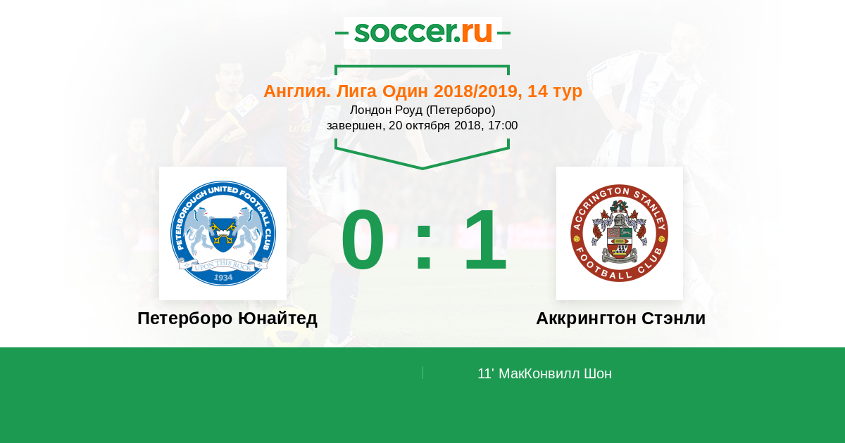 Англия. Первая Футбольная Лига 23.10.2019 Петерборо Юнайтед Логотип футбольный клуб Петерборо Юнайтед 4:0 Логотип футбольный клуб Аккрингтон Стэнли Аккрингтон Стэнли