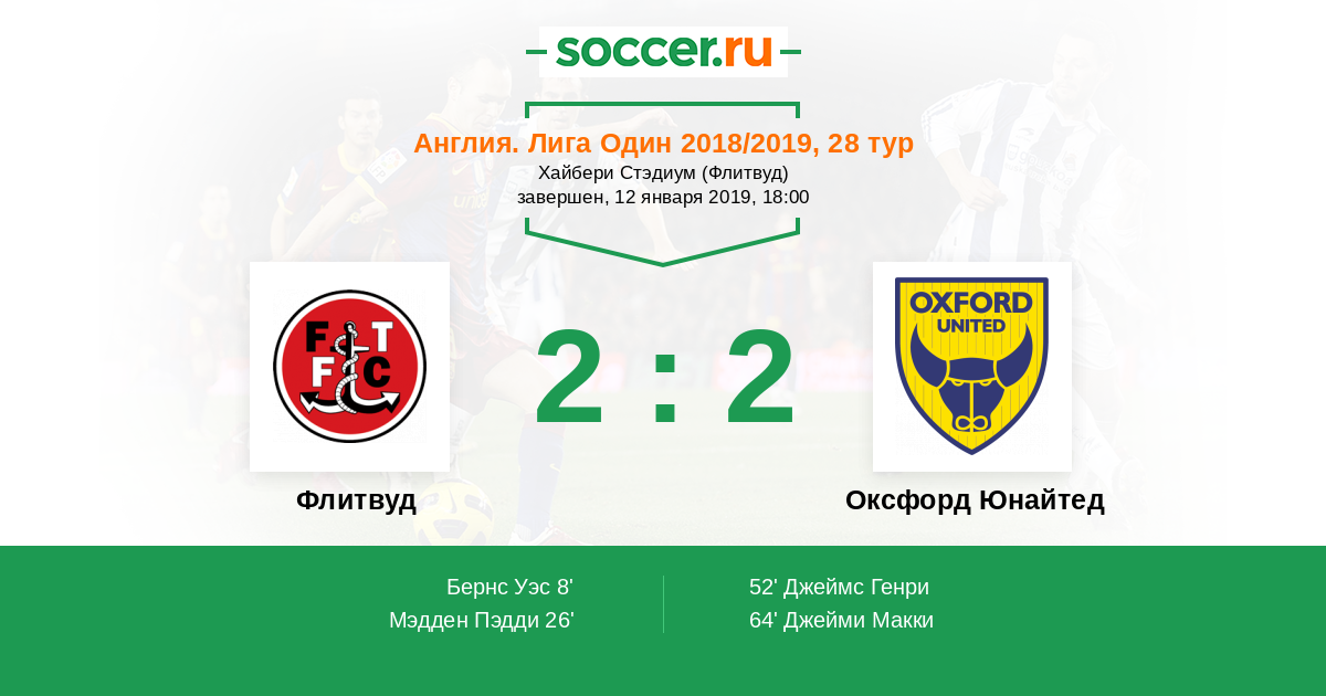 Англия. Вторая Футбольная Лига 26.01.2013 Флитвуд Логотип футбольный клуб Флитвуд 3:0 Логотип футбольный клуб Оксфорд Юнайтед Оксфорд Юнайтед